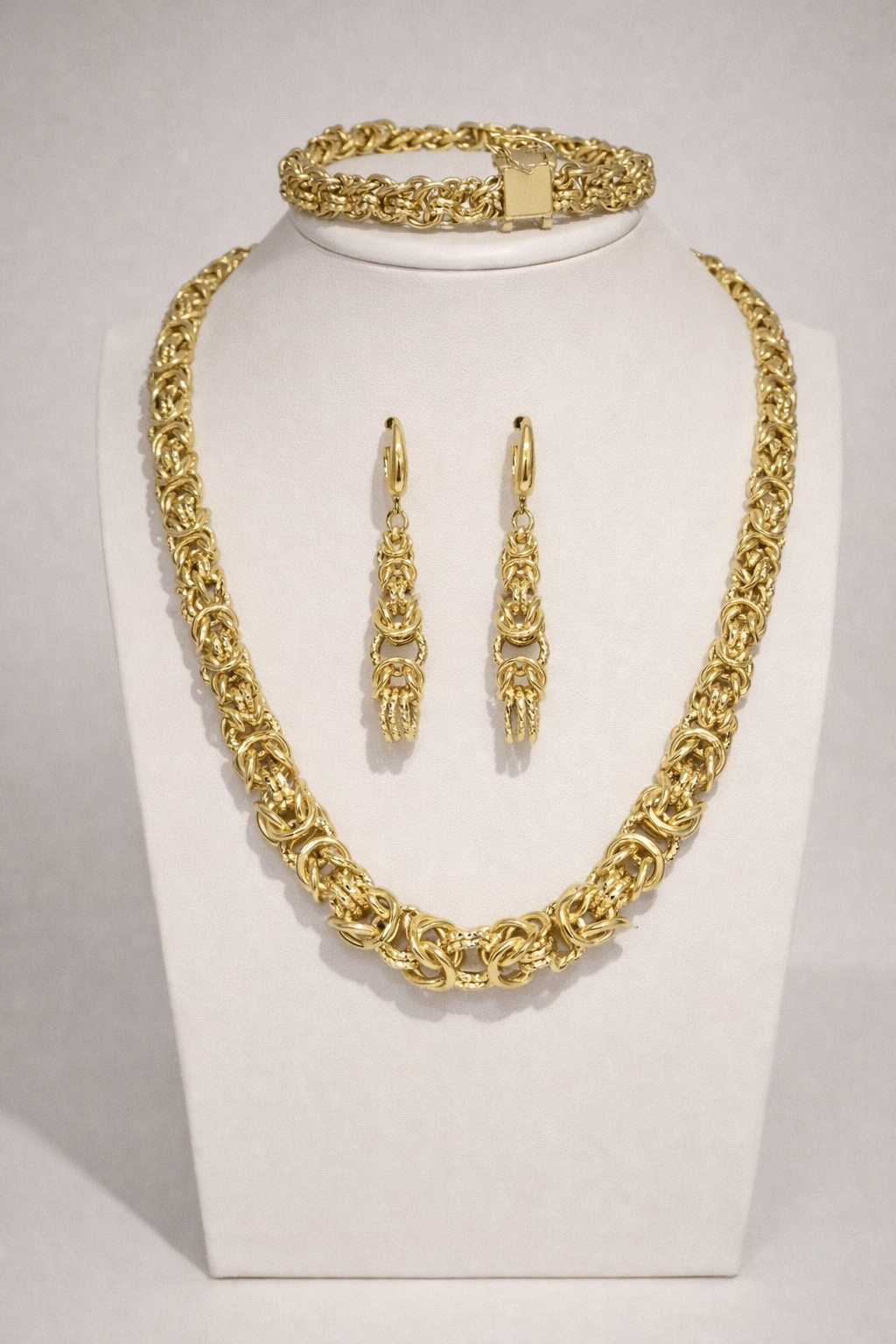 Conjunto imperial bañado en oro, de cadena trabajada y entrelazada, inspirado en la joyería árabe tradicional. Un diseño potente y majestuoso, que transmite poder, riqueza y distinción, ideal para quienes buscan una joya protagonista con presencia y carácter.