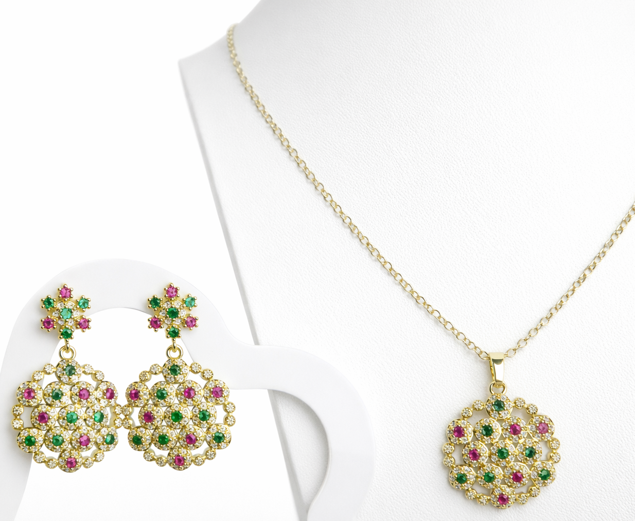 Conjunto de collar, anillo y pendientes bañados en oro 18k, con diseño floral calado y piedras multicolor en tonos verdes, fucsias y blancos. Una joya elegante y luminosa, ideal para aportar color y sofisticación a cualquier look.