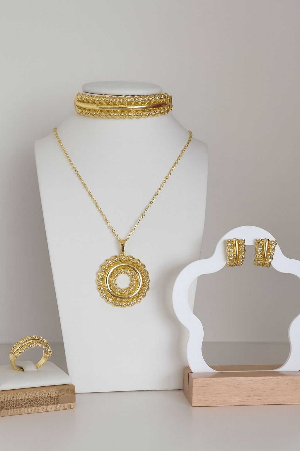 Conjunto árabe bañado en oro 18k, inspirado en el oro marroquí tradicional. Un diseño clásico y elegante, con presencia y carácter, pensado para destacar por su belleza artesanal.